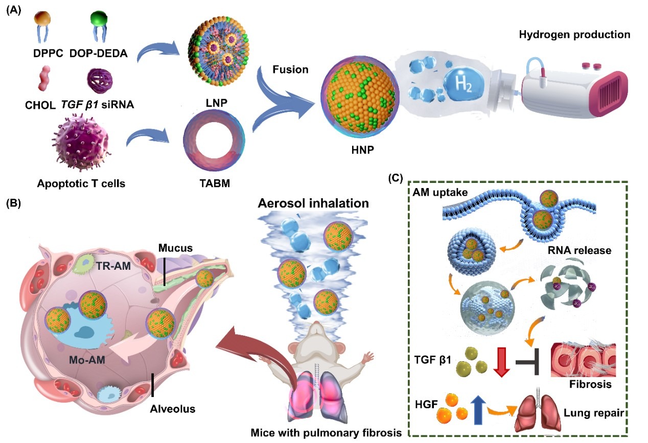 Pulmonary fibrosis (PF) is a chronic, progressive, and fatal interstitial lung disease with limited therapeutic options. Recent advancements in pulmonary gene therapy have shown the potential to halt or even reverse PF, particularly by focusing on correcting gene mutations in alveolar epithelial cells. Although gene therapies targeting alveolar epithelial cells have shown potential, their clinical application remains limited by technical bottlenecks in pulmonary delivery systems. To overcome these barriers, the research team developed an aerosol inhalation system that integrates three components: (1) a vibrating mesh nebuliser to aerosolise lipid nanoparticles (LNPs); (2) a hydrogen supplement system that exploits the low viscosity and anti-inflammatory properties of hydrogen to enhance mucus penetration; (3) a controlled dosing chamber to enable precise therapeutic delivery. The study hypothesised that hydrogen’s unique physicochemical properties (such as lower Reynolds numbers) could improve alveolar deposition and alleviate oxidative stress.