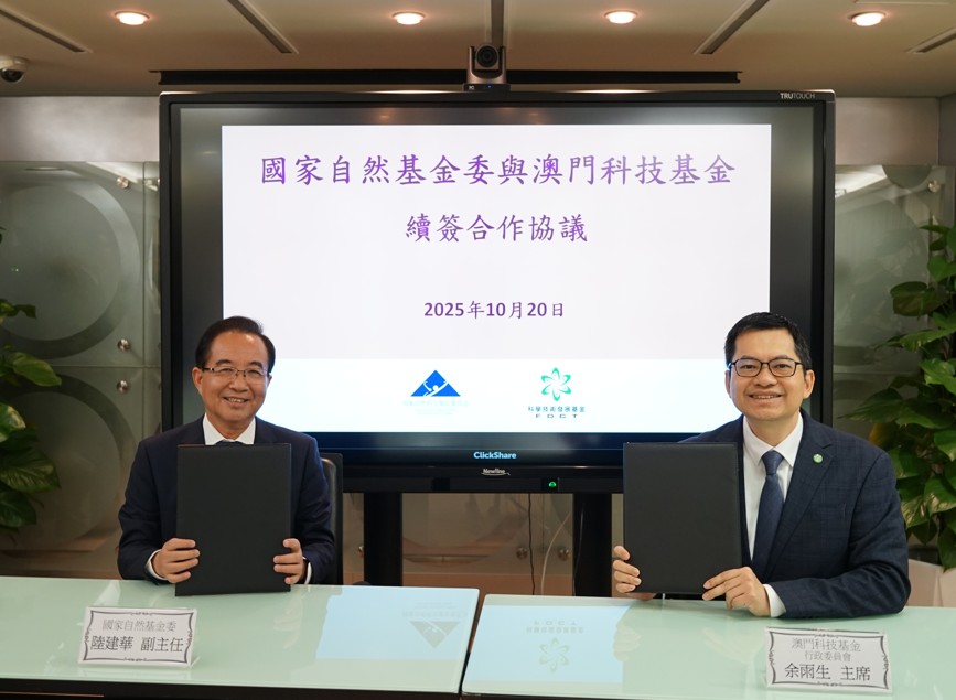 Vice Director of the National Natural Science Foundation of China (hereinafter “NSFC”) and academician of the Chinese Academy of Sciences, Lu Jianhua, led a delegation to Macao and held a working meeting today (20th) with Vincent U, President of the Administrative Committee of the Science and Technology Development Fund (hereinafter “FDCT”), during which three cooperation agreements were signed. Both parties will further deepen collaborative development between the Mainland of China and Macao in areas such as joint research funding, attracting international scientific and technological talents through Macao, and promoting international (regional) scientific and technological cooperation.