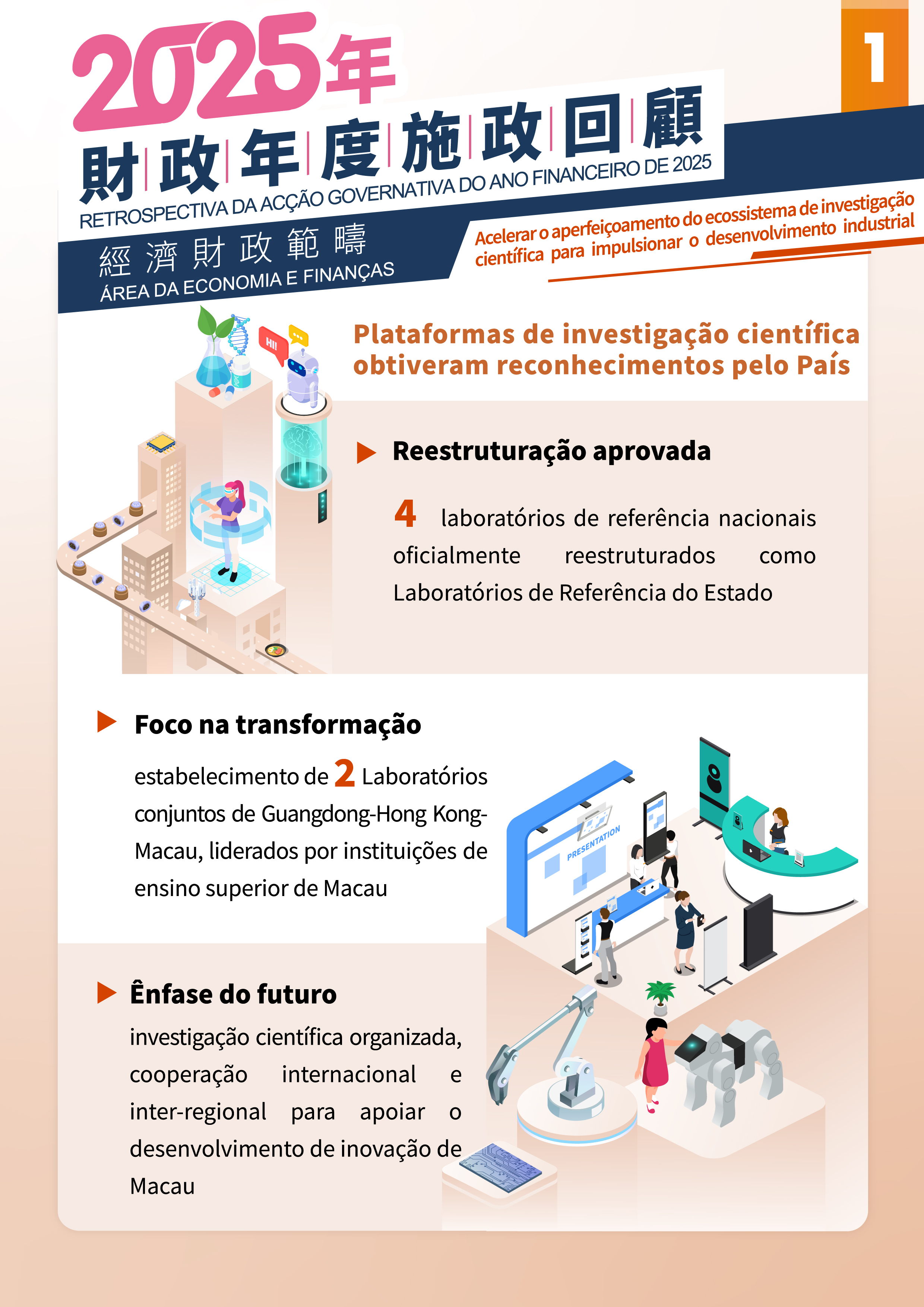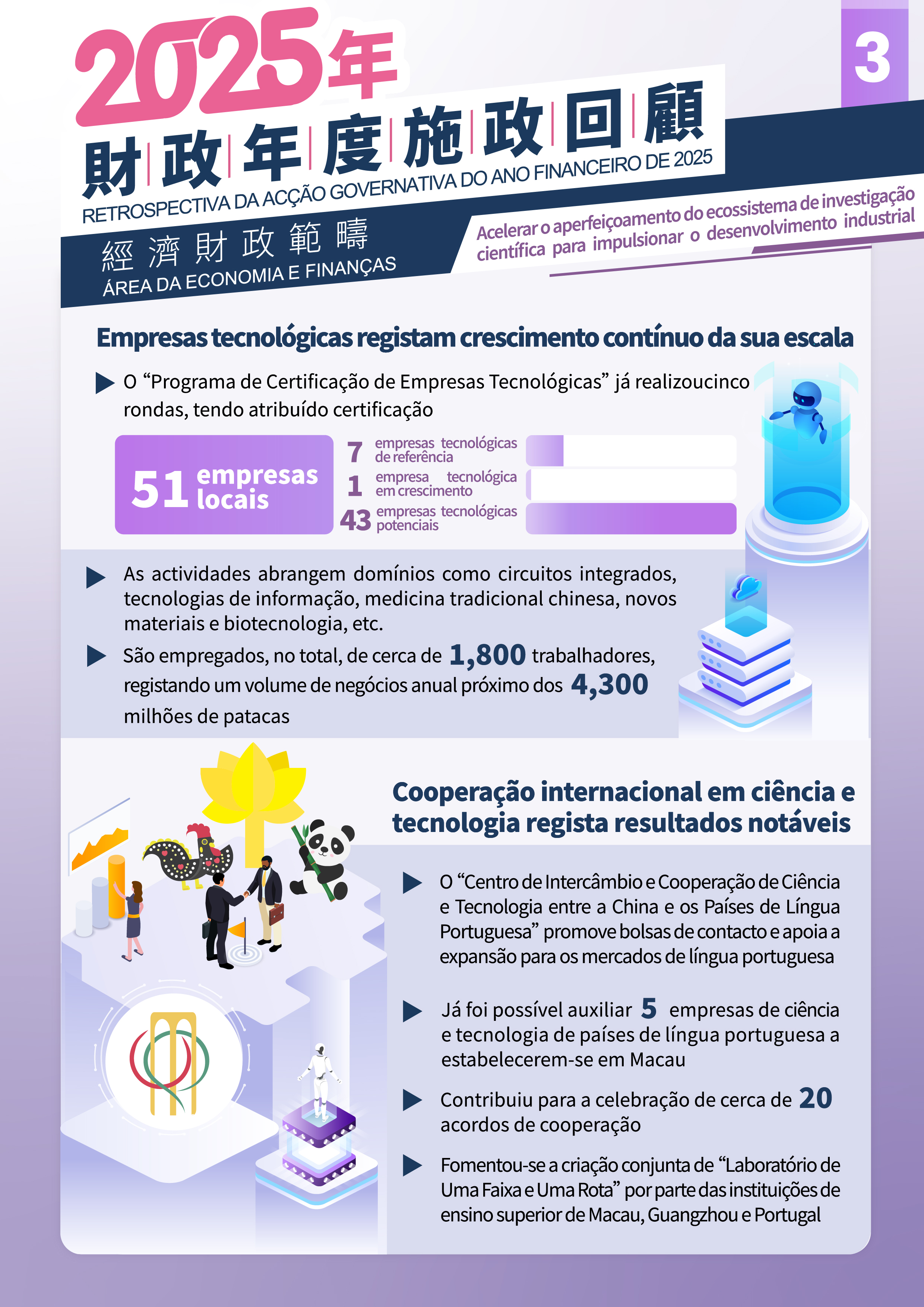 Para implementar o Relatório das Linhas Acção Governativa de 2025 nos pontos relativos à promoção do desenvolvimento da indústria de tecnologia de ponta adequada a Macau para atrair mais empresas de tecnologia inovadora para se estabelecerem em Macau, a Direcção dos Serviços de Economia e Desenvolvimento Tecnológico (doravante designada por DSEDT) e o Fundo para o Desenvolvimento das Ciências e da Tecnologia (doravante designado por FDCT) estão a adoptar várias medidas para impulsionar a integração da indústria-universidade-investigação através do impulsionamento contínuo de iniciativas como o “Programa de Certificação de Empresas Tecnológicas”, o “Plano de Financiamento para Investigação e Desenvolvimento Inovadores de Empresa” e a optimização de programas de investigação e desenvolvimento prioritários, acelerando assim o aperfeiçoamento do ecossistema de investigação científica e promovendo o desenvolvimento da indústria de tecnologia de Macau.