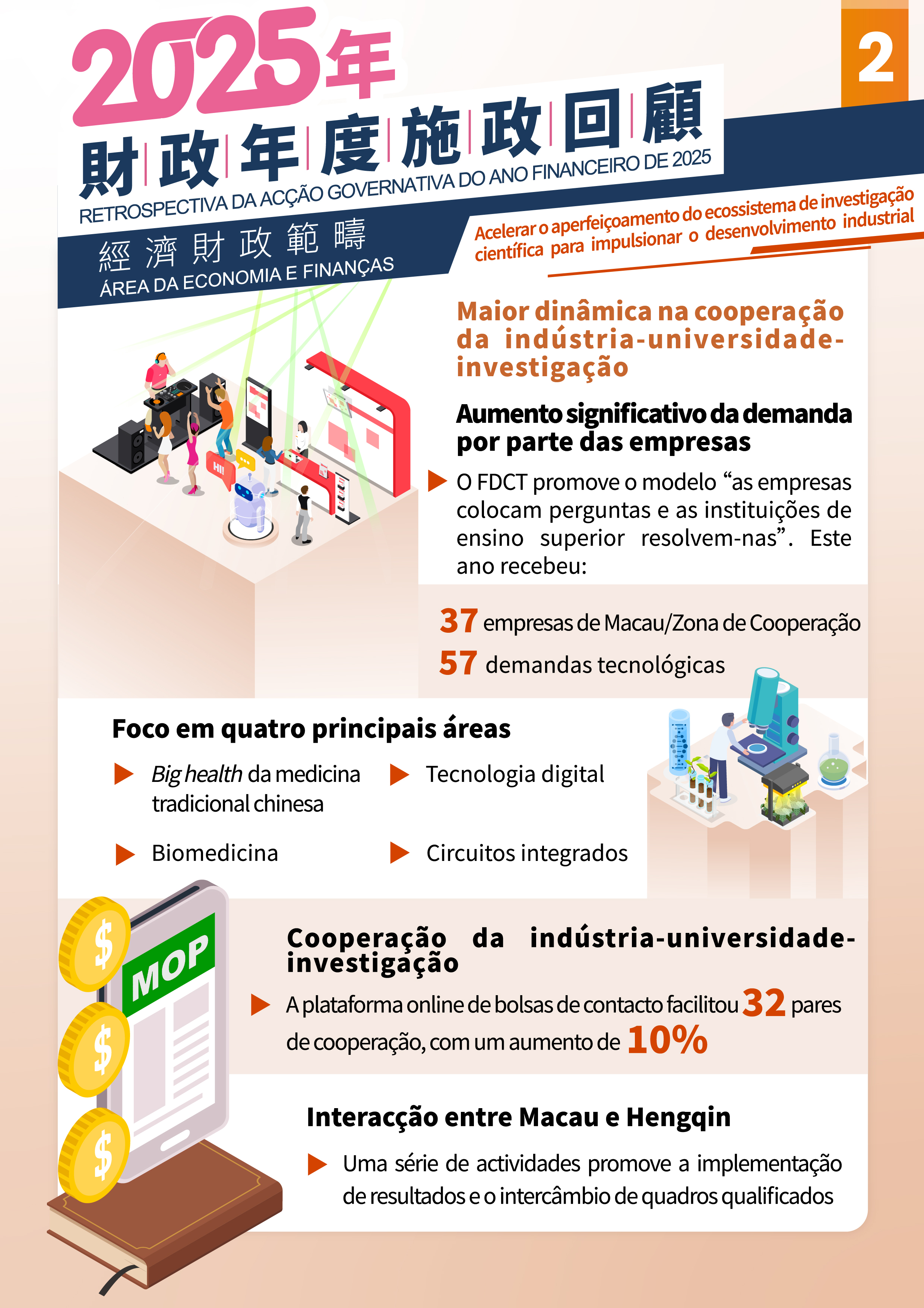 O FDCT promove a cooperação da indústria-universidade-investigação através do modelo “as empresas colocam perguntas e as instituições de ensino superior resolvem-nas”. Este ano, foram recolhidas 57 demandas tecnológicas de 37 empresas de Macau ou da Zona de Cooperação Aprofundada entre Guangdong e Macau em Hengqin (denominada “Zona de Cooperação”), representando um aumento de 2,4 vezes em relação ao ano passado, nas 4 principais áreas, big health da medicina tradicional chinesa, biomedicina, tecnologia digital e circuitos integrados.