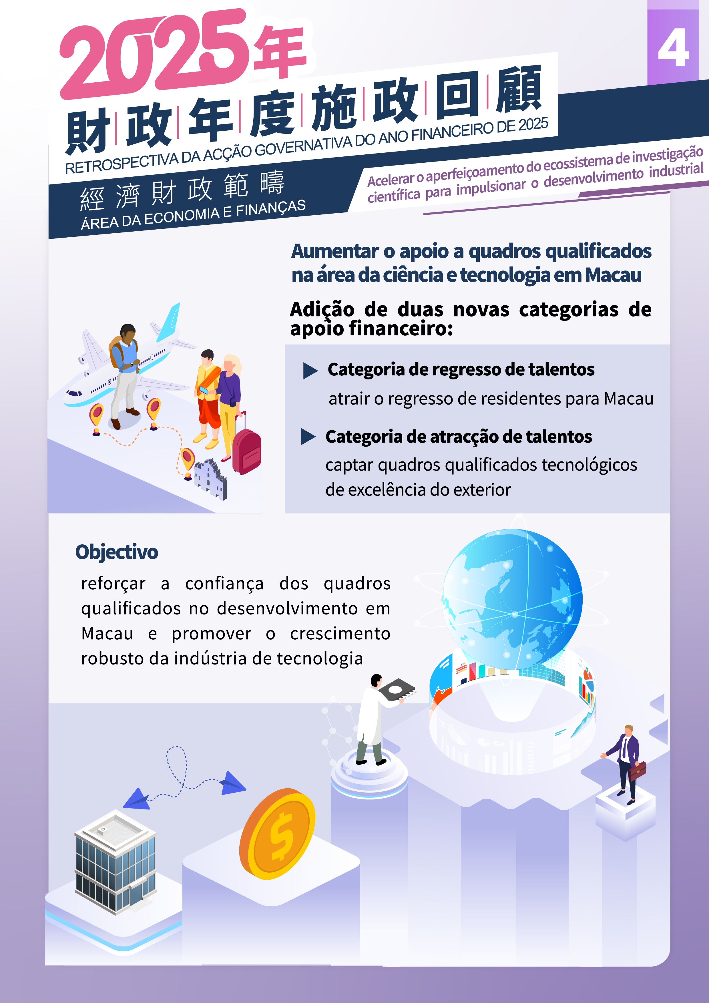 Os quadros qualificados na área de ciência e tecnologia são uma base importante para a tecnologia inovadora e o desenvolvimento industrial. Para atrair o regresso de residentes para Macau e a captação de quadros qualificados tecnológicos de excelência do exterior, o FDCT adicionou novas categorias de apoio financeiro: categoria de regresso de talentos e categoria de atracção de talentos, proporcionando apoio financeiro para iniciar projectos de I&D, ajudando assim os talentos a desenvolverem a sua I&D e empreendimentos empresariais em Macau.