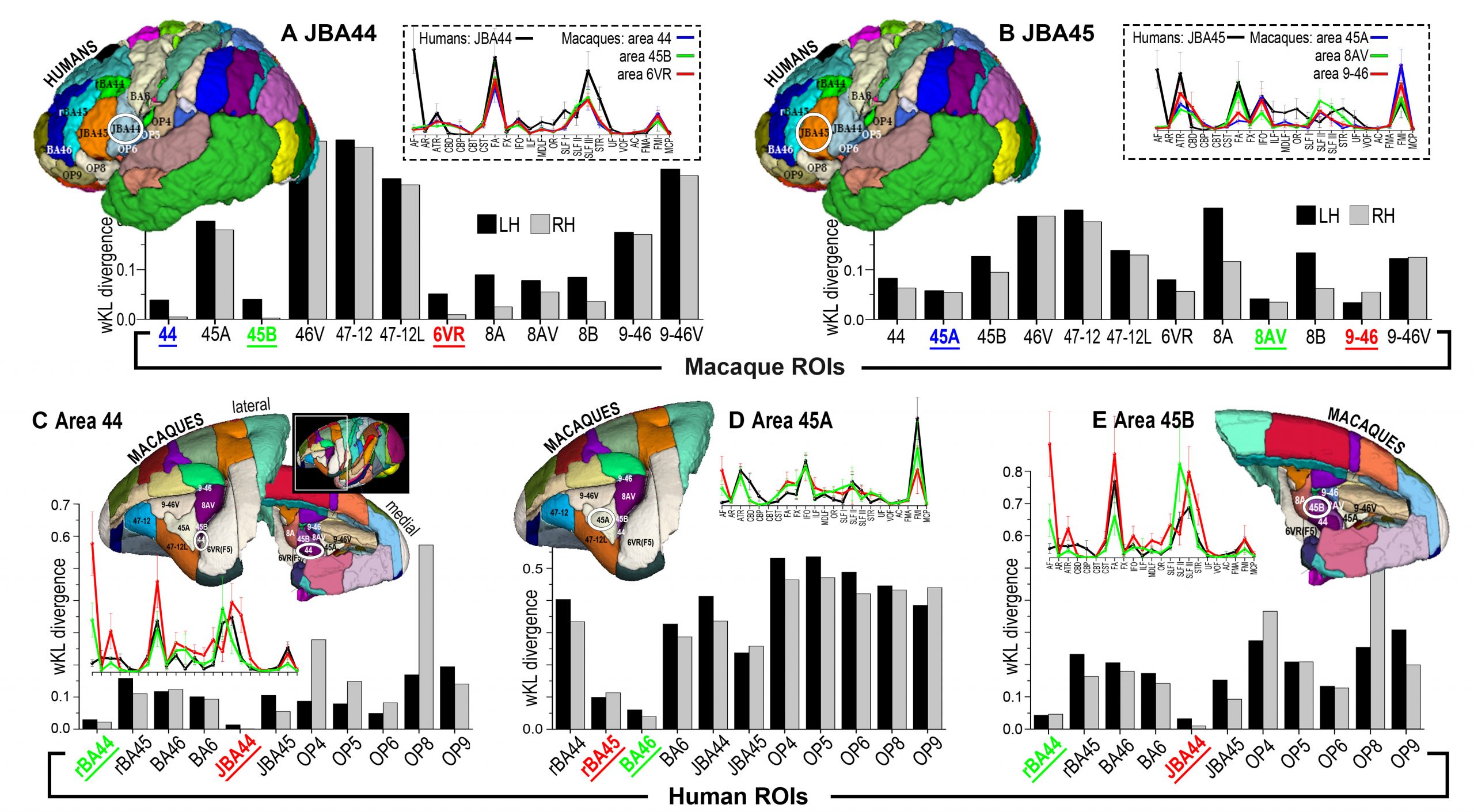 獼猴是研究人類的經典過渡模型。對兩個物種布羅卡區域結構連接的跨物種量化比較有助探索人類特有的高級認知功能(如語言),分析相關知識遷移的可靠性,進而可高效利用動物模型。然而,靈長類皮層同源區域的邊界定義比較模糊,該問題長期困繞著跨物種研究;此外,雖然針對布羅卡區域相關單個纖維束(如弓狀束)的跨物種比較已有重要差異發現,但全腦層面連接的量化比較仍然匱乏。