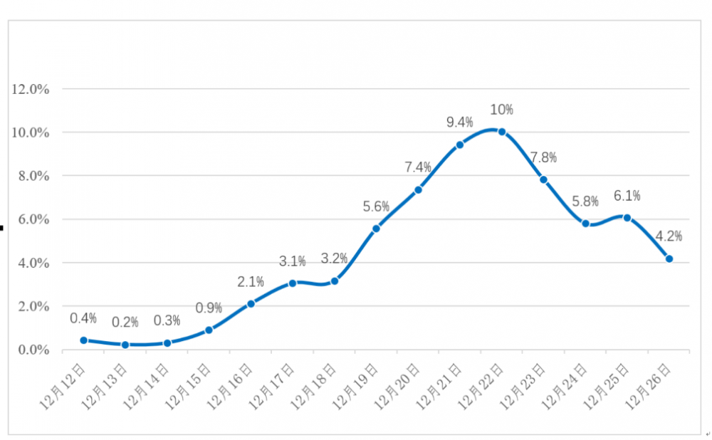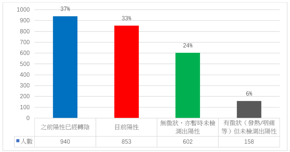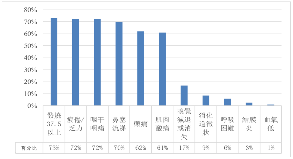 超過半數陽性樣本病程發生在5到10日間,其中36%感染樣本病程為5至7日,21%感染樣本病程為7至10日,18%感染樣本病程為3至5日,8%感染樣本病程為1至3日,2%感染樣本病程多於10日。年齡段越高,病程稍微趨向越長,年齡段越小,病程稍微趨向越短。感染新冠的高發徵狀為發燒37.5℃以上(73%),咽乾、咽痛(72%),疲倦、乏力(72%),鼻塞流鼻涕(70%),頭痛(62%),肌肉酸痛(60%)。其他徵狀相對佔比不高,約17%感染樣本出現嗅覺減退或消失徵狀,約9%感染樣本出現消化道徵狀(見圖4)。