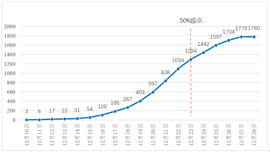 澳門科技大學創新工程學院「大規模流行病智能預測預警系統研究中心」(下稱「研究中心」)於2022年12月27日開展首輪「本澳新冠感染情况問卷調查」,隨機抽樣2553個樣本。樣本分析顯示,疫情傳播達峰日期為12月23日,當日感染樣本數達到256例,佔總樣本數10%(見圖1)。達峰日累積50%樣本已經由陽性轉陰或檢測陽性(見圖2)。有 1793 樣本已經確認被感染新冠病毒,約佔總樣本的 70%,其中目前陽性有 853 例,約佔 33%;陽性已經轉陰有 940 例,約佔37%。除此之外,在樣本中有症狀(發熱或咽痛等)但未檢測出陽性的有 158 例,約佔總樣本的 6%。無症狀亦暫時未檢測出陽性的有 602 例,約佔 24%(見圖3)。根據研究,重症峰值會比感染峰值滯後一周,目前應處於重症峰值的平台期,可持續2至3周,醫療系統壓力較大。