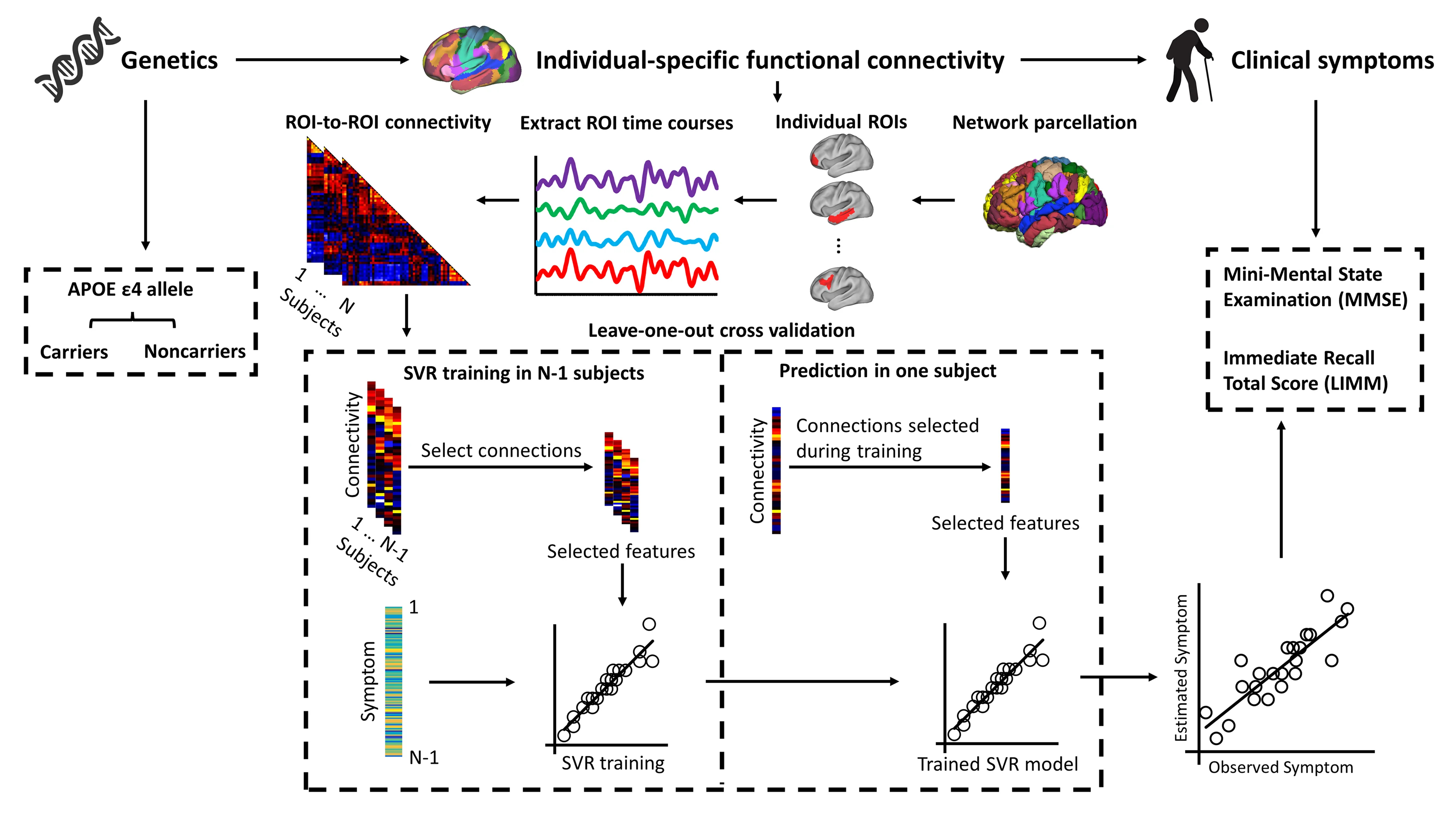研究人員採用235名(120名APOEε4等位基因攜帶者和115名APOE ε4等位基因非攜帶者)來自Alzheimer’s Disease Neuroimaging Initiative(ADNI)數據集中的老年人群神經影像學數據(年齡:60-85歲),並對每個個體構建基於個體水平的腦功能連接網絡。隨後利用基於遞歸特徵選擇的機器學習模型來揭示個體大腦和行爲的關係,並預測不同基因型的AD臨床症狀轉變。研究表明不同APOEε4基因型的老年人群個體化腦功能網絡能夠預測從CA、MCI到AD的臨床亞組,並對AD相關的臨床症狀表現出較高的預測水平。然而傳統基於腦圖譜的功能網絡在幾乎所有情況下都無法有效預測這些臨床症狀。