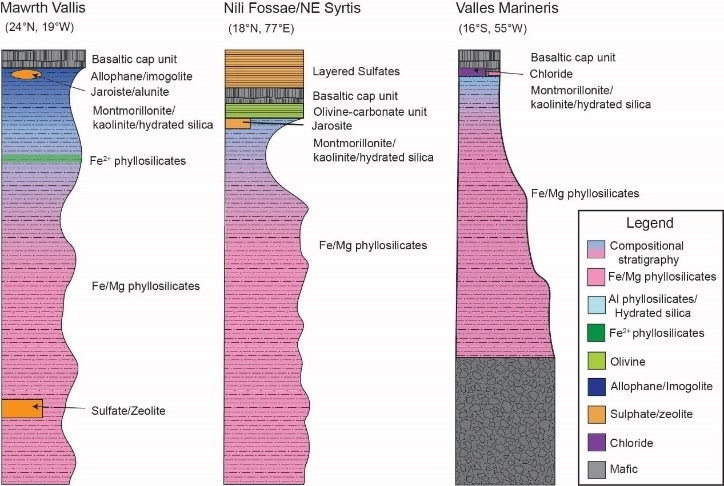 圖3 火星上三個典型富粘土礦物地區的地層剖面示意圖