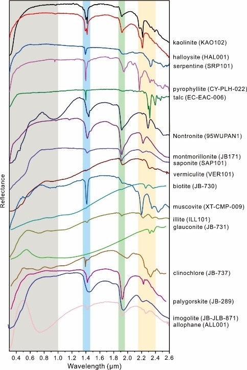 圖4 地球上不同類型粘土礦物的「標準」可見-近紅外光譜