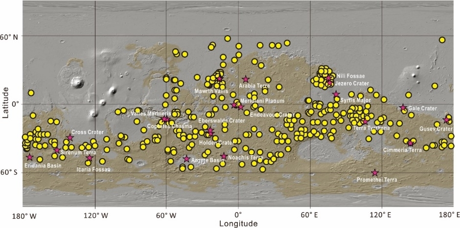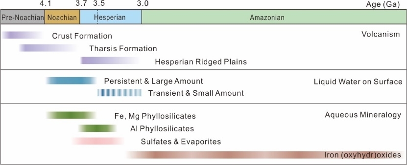 火星上的粘土礦物遍佈於諾亞紀和西方紀早期(>35億年)的古老地層中(圖2、圖3)。它們形成的起始和結束時間尚未得到較準確的限定,但它們的空間分佈與火星南部高地和北部低地之間的地形和地質年齡的二分性大體一致。