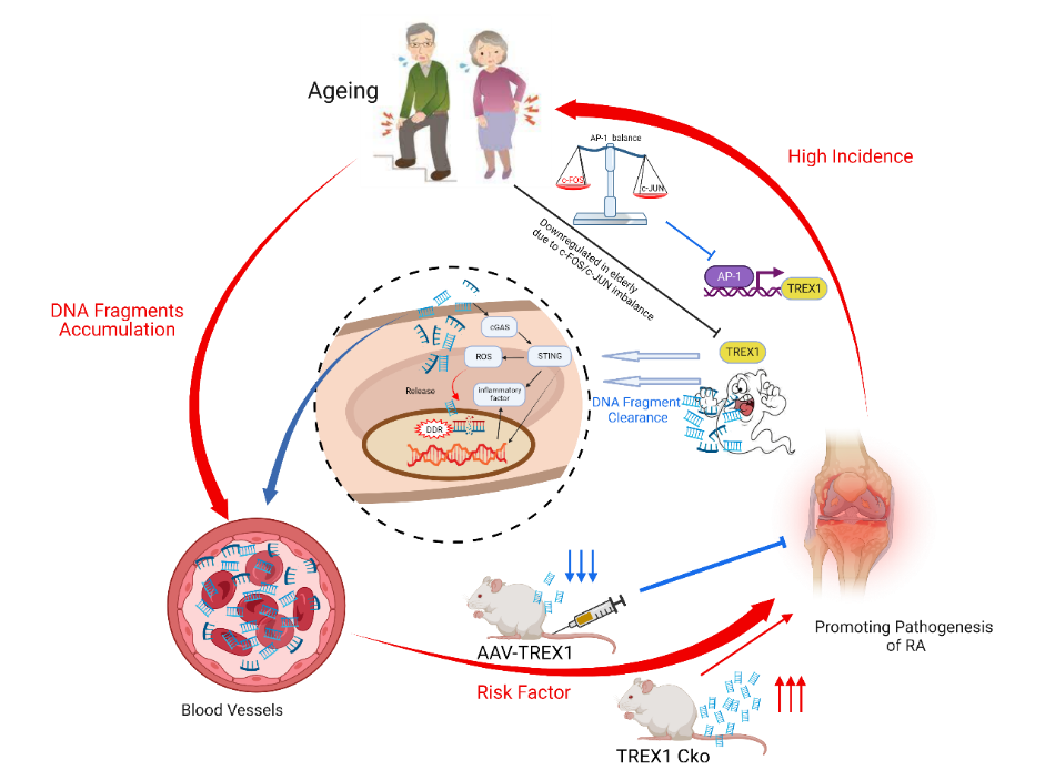 基於這一新發現,研究團隊巧妙地設計了一系列關節炎動物實驗予以驗證。研究團隊發現,關節炎動物模型中cfDNA碎片的積累被證實是由於TREX1表達減少所觸發的,最終促進了促炎細胞因數的釋放並在關節炎大鼠中產生炎症狀況。研究團隊更構建了世界上首個TREX1條件性基因敲除大鼠進行驗證,結果表明TREX1被剔除後會明顯增加大鼠關節炎的嚴重程度。相比之下,利用腺相關病毒在動物身上過表達TREX1基因,則顯著抑制了關節炎大鼠的衰老相關表癥,並有效抑制了關節炎炎症。進一步的機制研究發現,衰老細胞中c-Fos(TREX1轉錄因子AP-1的主要蛋白成分)的降低伴隨著對DNA碎片刺激的敏感性降低,直接導致TREX1表達水平下降,並可能導致炎症啟動延長,增加患上關節炎風險。研究結果強調,由於TREX1減少而導致的cfDNA積累可能是老年人RA發病機制的危險因素之一。這為研發預防老年人患RA的靶向新藥開闢了新思路。