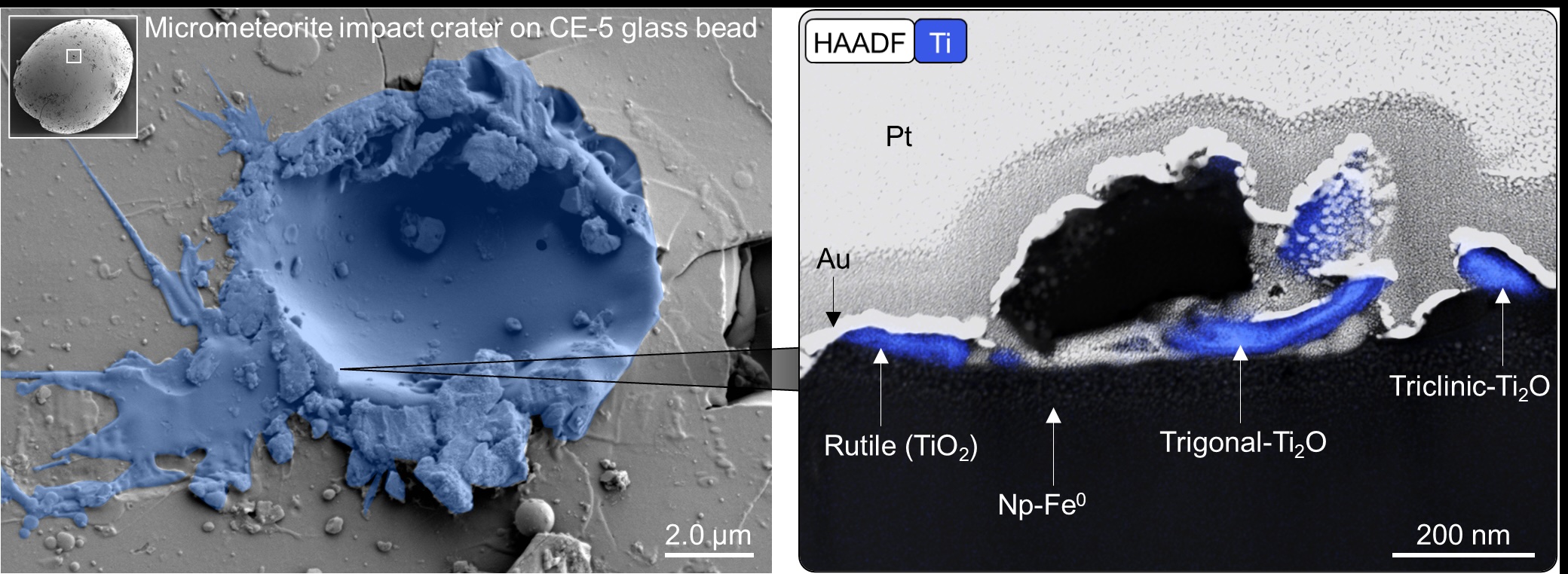圖1 月壤微隕石撞擊坑中的Ti納米礦物(左圖為假彩色圖,藍色區域為撞擊濺射物)