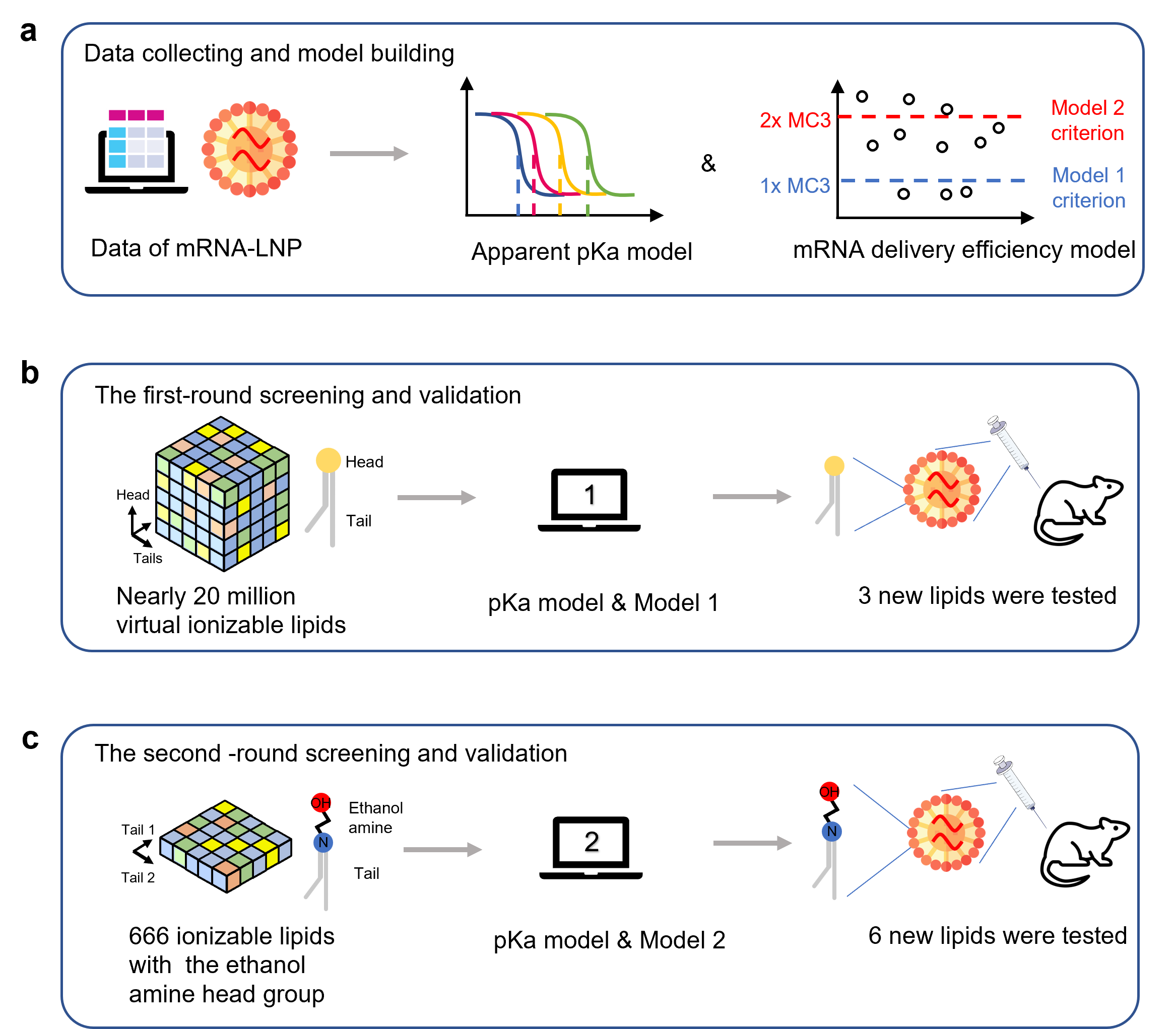 COVID-19 mRNA疫苗的成功證明脂質納米粒在mRNA遞送方面是極有效的。然而,LNP其中的關鍵成分——可電離脂質,傳統上需要通過低效且成本高昂的實驗篩選進行優化。因此,研究團隊開發了人工智能模型,預測LNP的關鍵屬性——表觀pKa和mRNA遞送效率,通過虛擬篩選促進可電離脂質的合理設計。在兩輪人工智能模型驅動的生成和篩選中,共評估了近2,000萬個可電離脂質,分別產生了三個和六個新分子。在小鼠測試驗證中,第一輪篩選獲得的一個含有苯環的脂質表現出與對照分子DLin-MC3-DMA(MC3)相當的性能,而第二輪篩選獲得的所有六個脂質都達到了或超過了MC3的性能,其中一個脂質的效果類似於一個更優的對照脂質SM-102。此外,研究團隊開發的人工智能模型在結構—活性關係上具有可解釋性。這項研究證明了人工智能技術在mRNA藥物產品開發中的巨大潛力,可提高藥物研發效率。