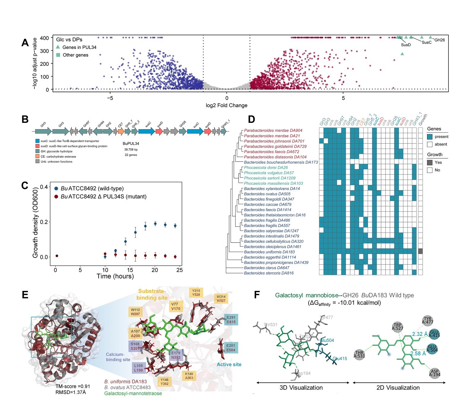 研究團隊系統地繪製了28種人體腸道擬桿菌和副擬桿菌利用20種中藥多糖的生長表型的圖譜,發現腸道擬桿菌之間和中藥多糖之間存在顯著生長差異。其中,鐵皮石斛多糖(一種葡甘聚糖)能特別促進單形擬桿菌(B. uniformis DA183)的生長。為了揭示石斛多糖選擇性促進單形擬桿菌生長背後的遺傳機制,該研究進行了比較轉錄組分析和基因敲除實驗。結果表明,多糖利用基因簇PUL34和關鍵酶GH26_BuDA183對於單形擬桿菌DA183菌株利用石斛多糖至關重要。透過序列比對分析,發現只有單形擬桿菌DA183的基因組能編碼完整的PUL34_BuDA183基因簇。