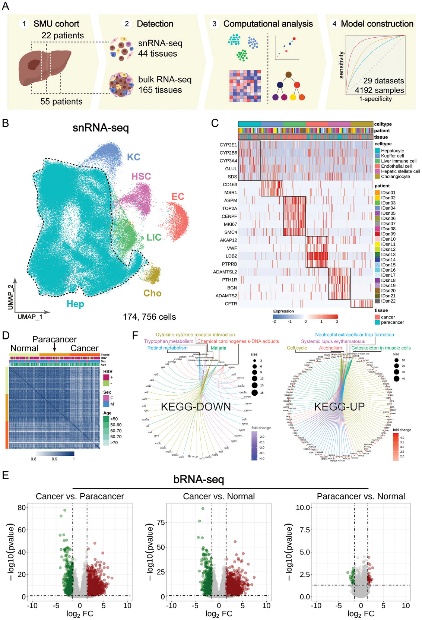 該研究基於HCC小樣本單細胞核測序發現和鑒定了10種不同的肝細胞亞群及其不同的分子圖譜和癌症演進風險,繼而以較大樣本的群體細胞測序進行了初步驗證;並設計了一個新的分位數評分整合方案,有效整合了多個形式各異的獨立隊列大樣本轉錄組數據,結合機器學習,建立了疾病診療模型;還提出了基於分子調控機制的一個肝癌分型新方案,預測出不同亞型的敏感性藥物。這一研究成功揭示了肝癌發生的新機制、新靶點和新分型,為肝癌的早期診斷和治療提供了新的理論依據。這一研究成果近日在國際權威學術期刊 Advanced Science (先進科學雜誌,影響因數14.3,1區)發表“Deciphering the Oncogenic Landscape of Hepatocytes Through Integrated Single-Nucleus and Bulk RNA-Seq of Hepatocellular Carcinoma”。