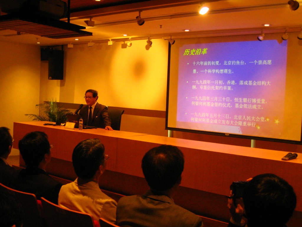 評選委員會段瑞春秘書長在介紹會上對該基金的情況做了全面的介紹。根據何梁何利基金現設三個主要奬項,包括最高的科學與技術成就奬,要求獲奬者長期致力推進國家科學技術進步,有卓著貢獻,在歷史上取得高水準學術成就;在科學技術前沿,取得重大科技突破,攀登當今科技高峰,領先世界先進水平;能推進技術創新,建立強大自主知識產權和自主品牌,產業居於當今世界前列者。奬項設奬牌及奬金一百萬港元,成立至今共有27位傑出科學家獲此殊榮。