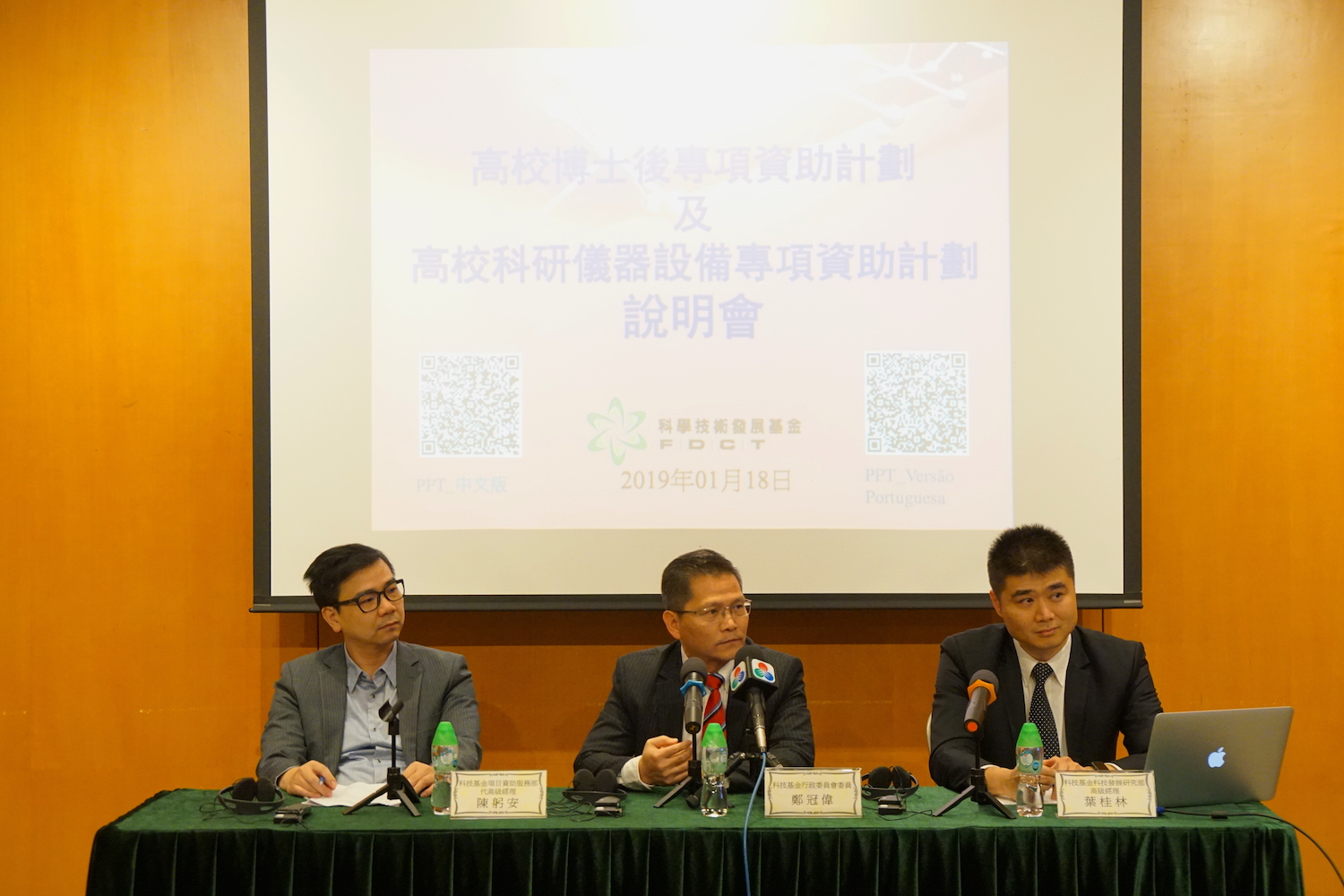 科學技術發展基金1月18日辦“高校博士後專項資助計劃及高校科研儀器設備專項資助計劃說明會”,兩項計劃旨在支持本澳高等院校聘任海內外優秀科技學科的博士來澳全職做博士後研究工作,提升本地高等院校科創新能力。科技基金今年用於項目資助的預算增加至5.35億元,新增預算用於推出一系列新的資助計劃。科學技術發展基金行政委員會主席馬志毅、委員鄭冠偉、科技發展研究部高級經理葉桂林及項目資助服務部代高級經理陳躬安主持說明會,逾五十名高校代表出席。